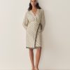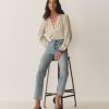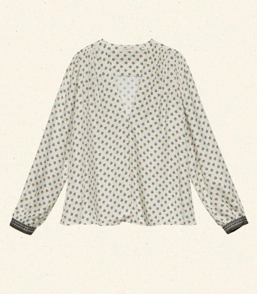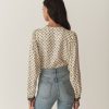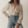 Crafted from a buttery silk-viscose twill, the ‘70s-inspired Candace Top features a plunging V-neckline, a drapey cut, generous full-length sleeves with self-covered buttons at the cuffs, and shirring at the shoulders for texture. Three hidden snap closures fasten at the front. Inspired by a vintage silk scarf from our styling team’s personal collection, our Riviera Foulard print features placed borders at the cuffs.