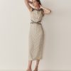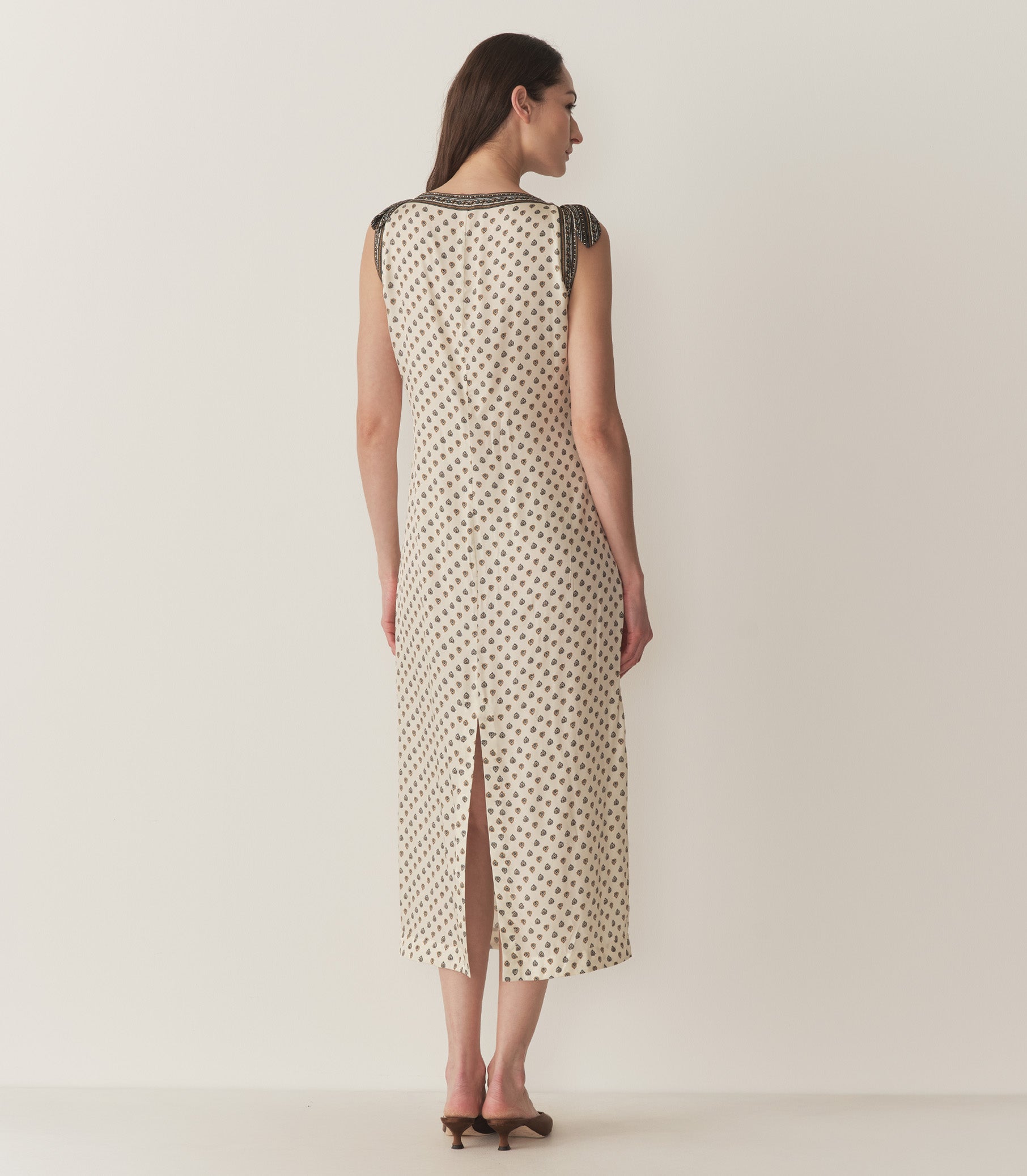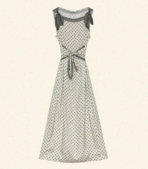 Crafted from a buttery silk-viscose twill, the Amorette is a sleeveless column dress with a bateau neckline, functional waist and shoulder ties, and a center back slit at the hem for ease of movement. Inspired by a vintage silk scarf from our styling team’s personal collection, our Riviera Foulard print features placed borders at the neckline and sleeve openings.