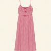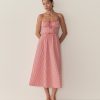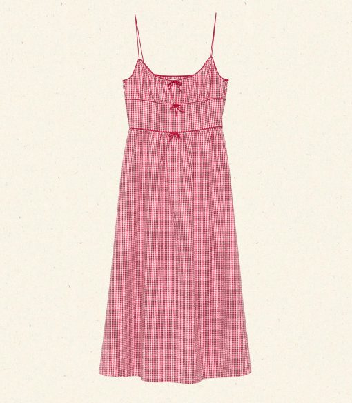 In crisp, lightweight cotton seersucker, the Belline Dress features a square neckline and ultra-skinny spaghetti straps. A fitted bodice with an invisible side zipper gives way to an ankle-grazing A-line skirt with a single tier. Contrast piping adorns the neckline, straps, and waistline, and three fixed bows extend down the bust.