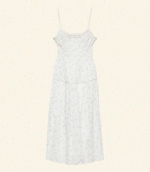 In soft organic cotton voile, the Brigide Dress takes cues from our fan-favorite Benoit Dress, adorned with our ‘50s-inspired Cottage Grove. It features a soft sweetheart neckline trimmed with scalloped-edge lace and ultra-skinny spaghetti straps. A fitted bodice with elasticized smocking gives way to an ankle-grazing A-line skirt.