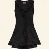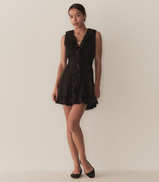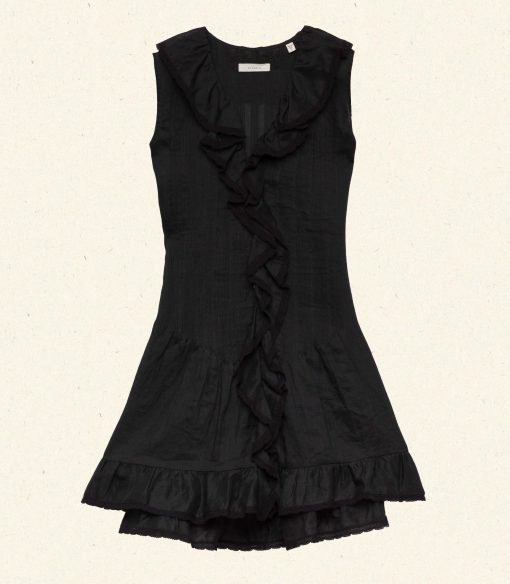 Rendered in a lightweight ramie, the Henrietta is a sleeveless button-front mini dress. The plunging V-neckline is framed by a cascading lace-trimmed ruffle that extends down the bodice and along the skirt’s hem. Pintucks lend texture to the relaxed bodice, which can be cinched at the back with a waist tie. A line of hidden starburst buttons extends down the front.