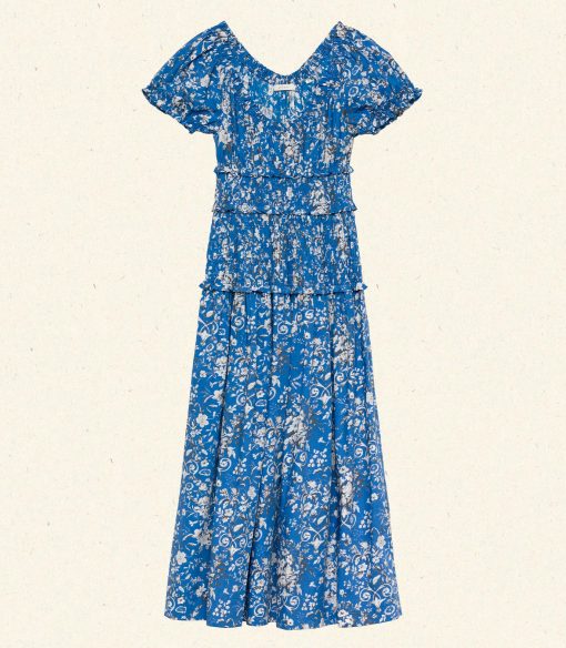 Crafted in a crisp organic cotton poplin and reimagined in our Jardins de la Fontaine, the Leanne Dress features a scoop neckline, gathered bust, and fitted bodice framed with petite ruffles. A third gathered panel finishes just below the hips, flaring out into an ankle-length skirt, while elastic lends give to the short puffed sleeves, bust, and waist.