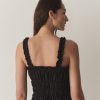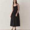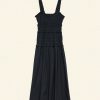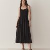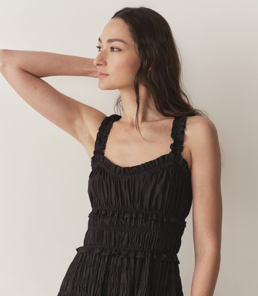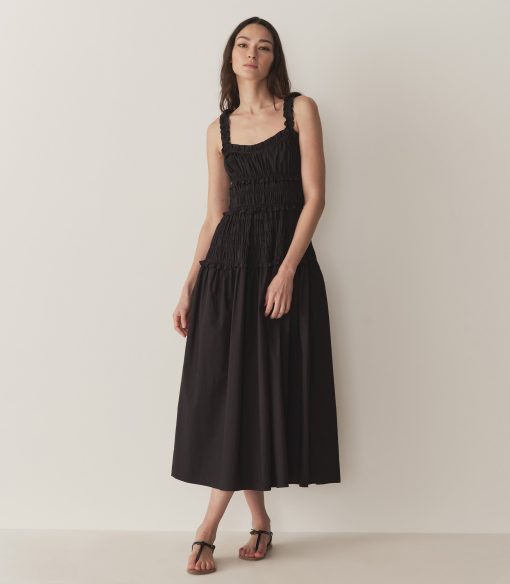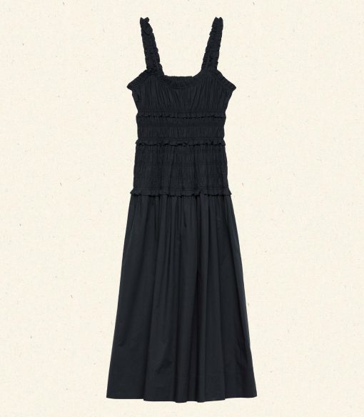 Crafted from crisp organic cotton poplin, the Marianne Dress features a square neckline, a gathered bust, and a fitted bodice framed with petite ruffles. A third gathered panel finishes just below the hips, flaring out into a full-length skirt, while elastic lends give to the straps, bust, and waist.