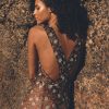 An early season favorite of both Margaret and Katherine, the Mireille Dress is crafted from a sheer tulle with allover ‘30s-inspired embroidered florals, featuring a high cowl neckline, criss-cross straps at the open back, and a floor-sweeping skirt with seaming details. The detachable viscose slip can be worn underneath for more coverage.