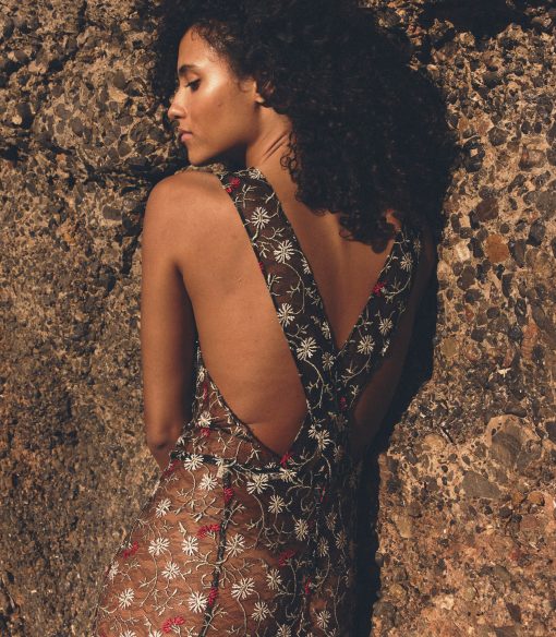 An early season favorite of both Margaret and Katherine, the Mireille Dress is crafted from a sheer tulle with allover ‘30s-inspired embroidered florals, featuring a high cowl neckline, criss-cross straps at the open back, and a floor-sweeping skirt with seaming details. The detachable viscose slip can be worn underneath for more coverage.