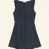 nTaking cues from our best-selling Aubrey Dress, the silk-viscose twill Monette Dress is a sleeveless style with a bateau neckline and swingy mini hemline, adorned with our playful navy-and-white Hepburn Dot. Princess seams lend structure to the bodice, while a back waist tie allows you to adjust the fit. Self-covered buttons extend down the front.