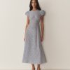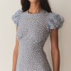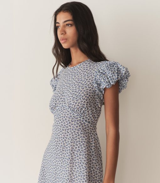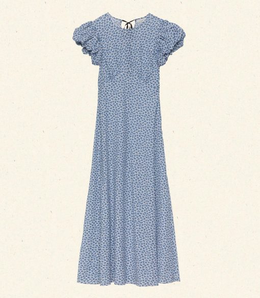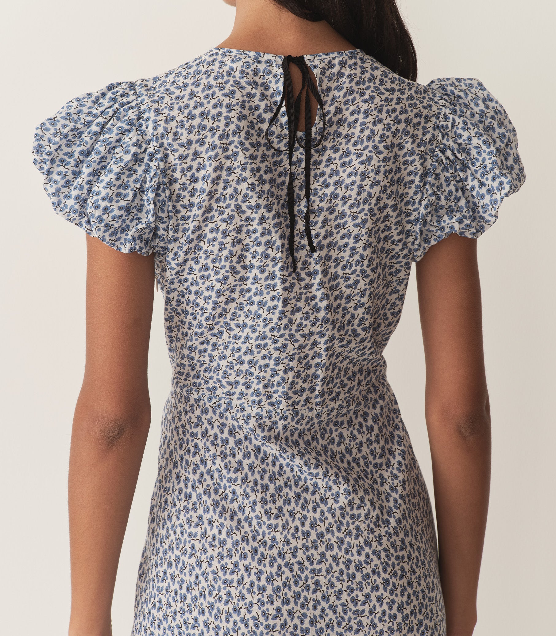 Crafted in a soft, lightweight organic cotton voile and adorned with our Cornflower Hillside Bloom, the Romina features a high neck and short puffed sleeves. The bodice is detailed with pointed underbust seams for structure, giving way to an ankle-grazing bias-cut skirt, and a delicate grosgrain ribbon ties at the back.