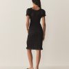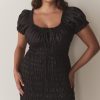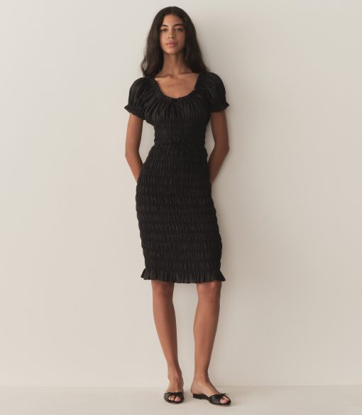 In a lightweight ramie, the Rosalynn Dress features short puffed sleeves, a scoop neckline, and allover smocking at the bodice and skirt, with functional ties at the neckline and waist. A fitted silhouette gives way to a skirt that finishes just below the knee, and petite ruffles adorn the sleeve cuffs and hem for a touch of vintage charm.