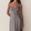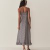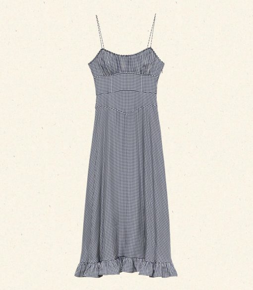 nIn a swingy silk-viscose twill and rendered in our nostalgic navy Santa Marina Gingham, the Rosaria Dress features a square neckline, ultra-skinny spaghetti straps, and a ruched bust. A fitted waist with an invisible side zipper gives way to an ankle-grazing A-line skirt with a ruffle trim.