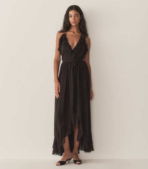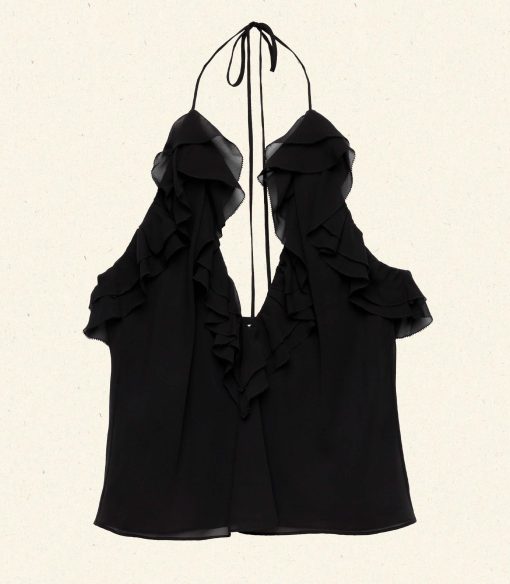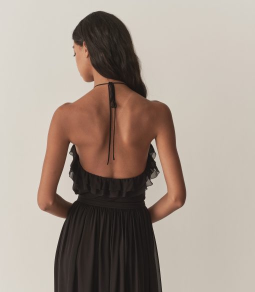 Taking cues from the disco halter tops of the 1970s, the Emmelie Top is crafted from a floaty silk georgette lined with soft viscose, featuring a plunging V-neckline framed with cascading ruffles and a self-tie halter strap. Pair with the Elisa Skirt for a matching set.