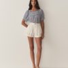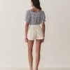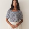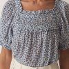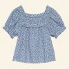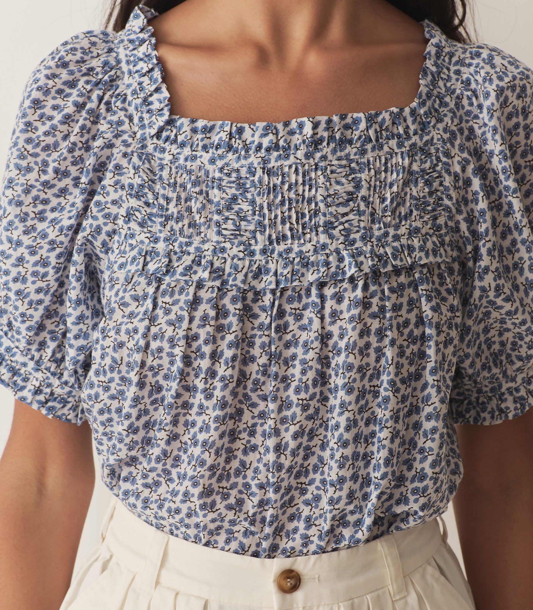 Crafted in a soft, lightweight organic cotton voile and adorned with our Cornflower Hillside Bloom, the Frances Top—which we first designed in 2019—is a Favorite Character featuring a breezy silhouette, a square neckline, and short puffed sleeves trimmed with petite ruffles. A square yoke is adorned with alternating panels of ruching and pintucks. Wear it loose, or tuck it into your favorite pair of high-waisted jeans.