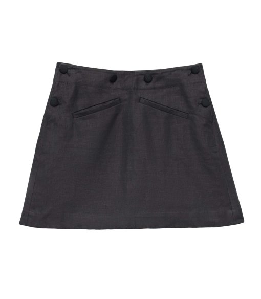 Tailored in soft midweight hemp with a cotton lining, the Lindy Skirt—which takes cues from ‘60s nautical styles—features an ultra-high waist, an A-line cut, welt pockets, and a mini-length hemline. The waistband is adorned with two fixed self-covered buttons, while additional buttons fasten at both sides.