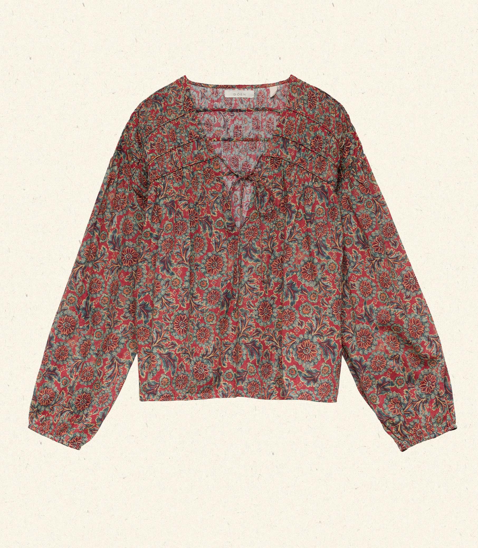 A nod to one of our earliest styles—the Marche Dress from our first collection—the Renelle Top is crafted from soft, lightweight organic cotton voile adorned with our Soleil Fleurit print, a motif inspired by an antique French block-printed quilt sourced by our co-founder Katherine. It features a high V-neckline with a functional tie, fixed smocking at the yoke, and voluminous drop sleeves finished with elasticized cuffs.