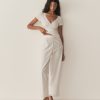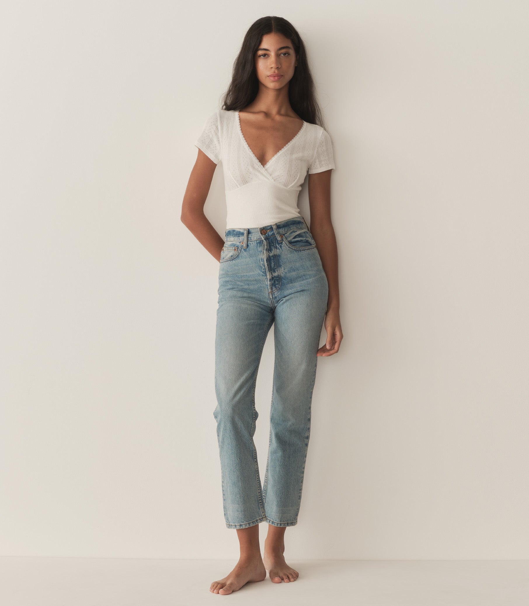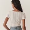 In the softest organic cotton, the Livia Tee features delicate pointelle at the bodice and sleeves, a close fit rib throughout the body, and a wrap V-neckline trimmed with delicate elastic lace.