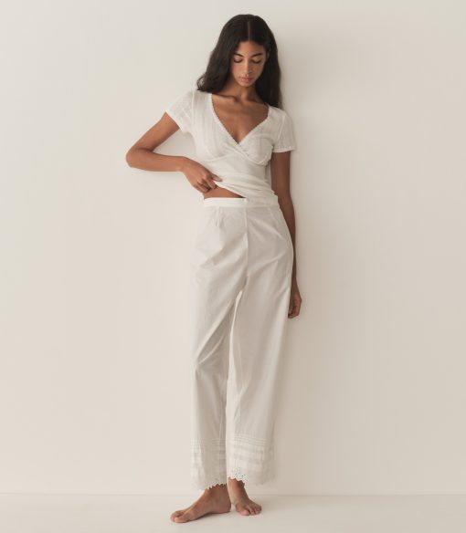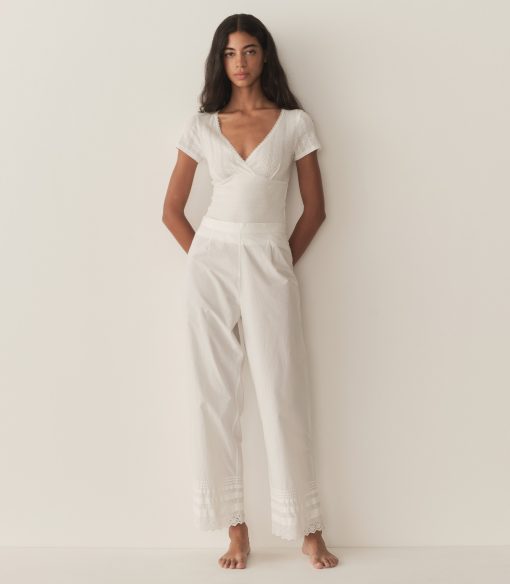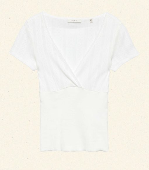 In the softest organic cotton, the Livia Tee features delicate pointelle at the bodice and sleeves, a close fit rib throughout the body, and a wrap V-neckline trimmed with delicate elastic lace.