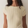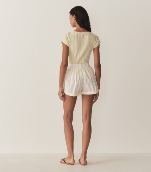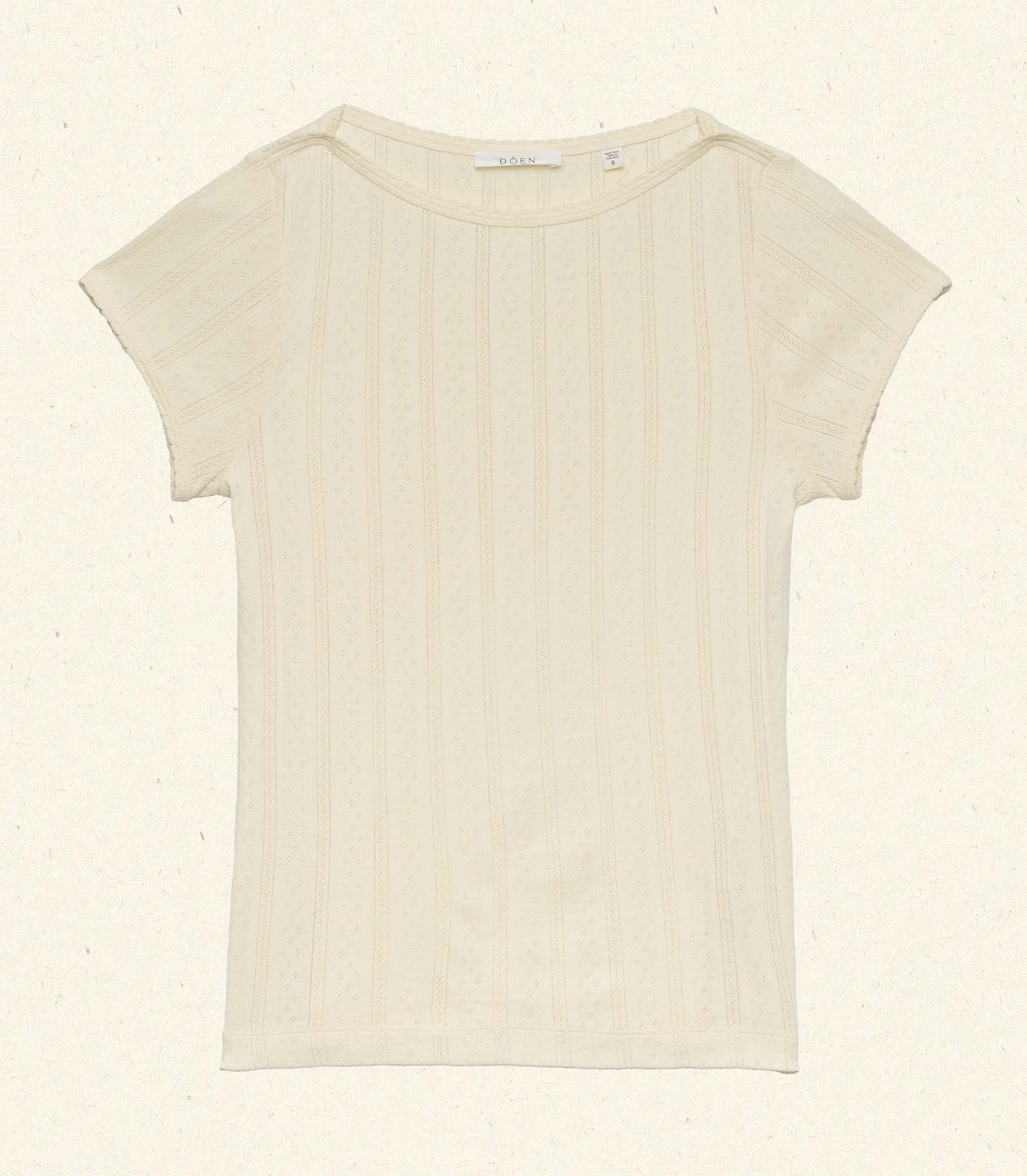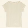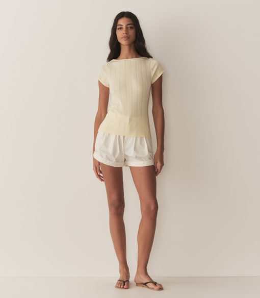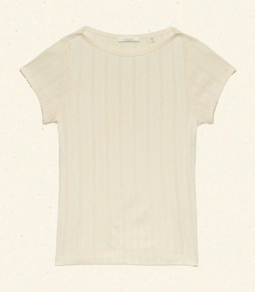 In the softest organic cotton pointelle, the ‘60s-inspired Pauline Tee features a bateau neckline, short sleeves, and a fitted silhouette. A delicate scallop binding details the neckline and sleeve edges.