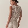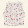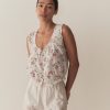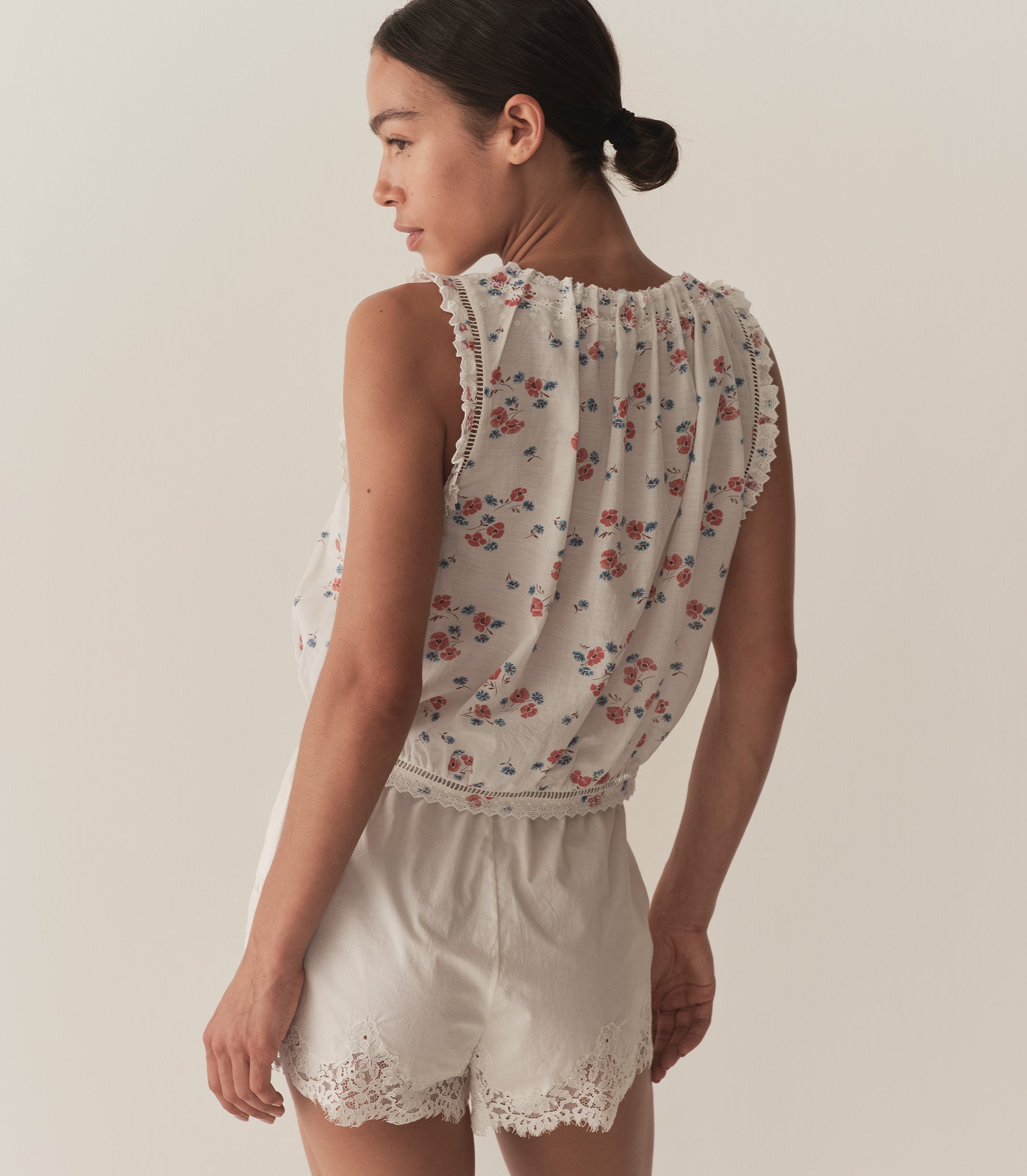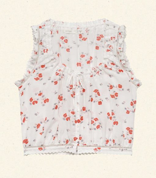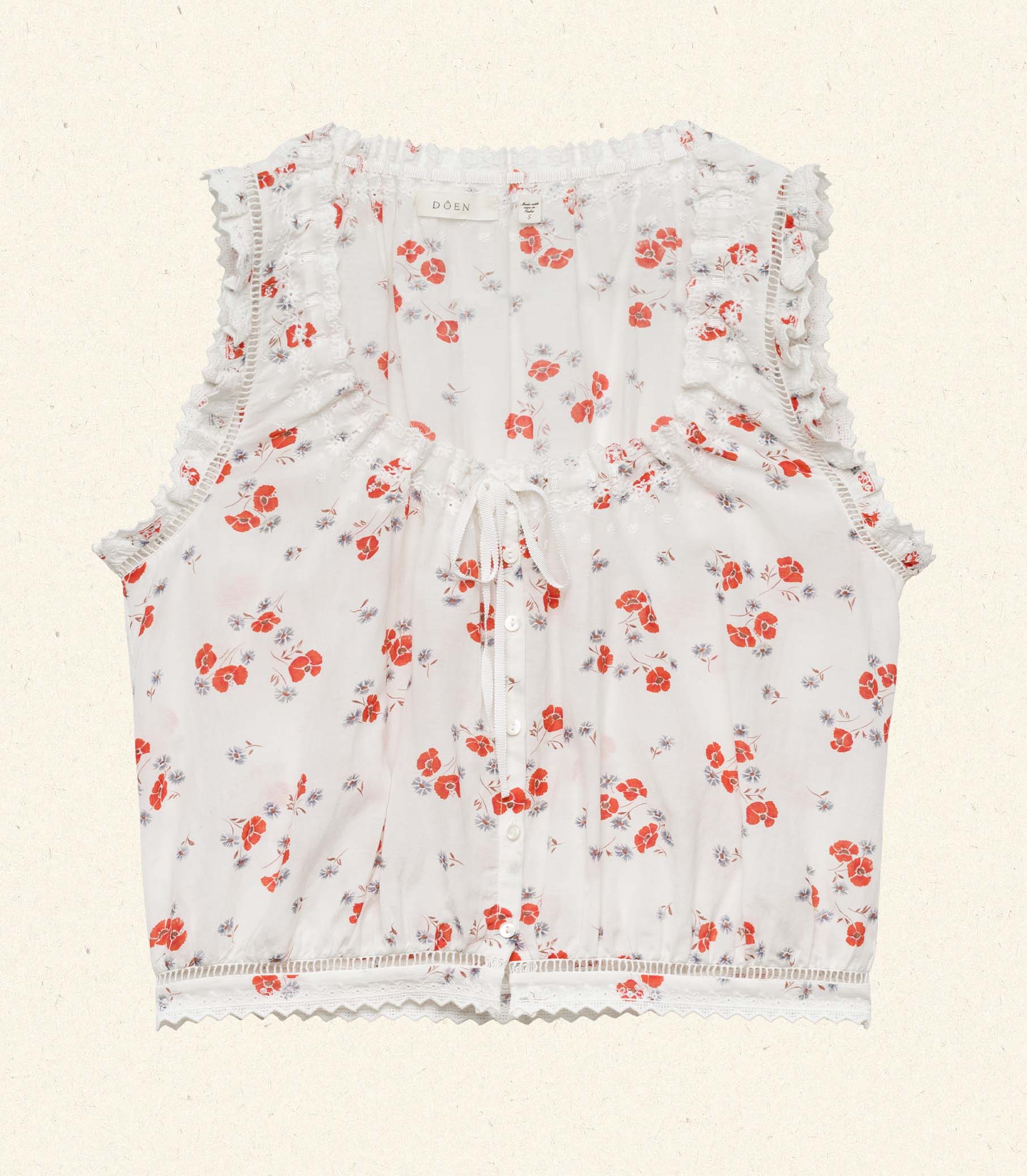 Our classic Traveler Top returns, now in a soft, lightweight blend of organic cotton and viscose and rendered in our ‘30s-inspired Poppy Field print. With a slightly cropped silhouette, mother-of-pearl buttons, and a scoop neckline with a grosgrain ribbon tie, it’s detailed with scallop eyelets and ladder trim at the neckline, sleeve openings, and hemline.
